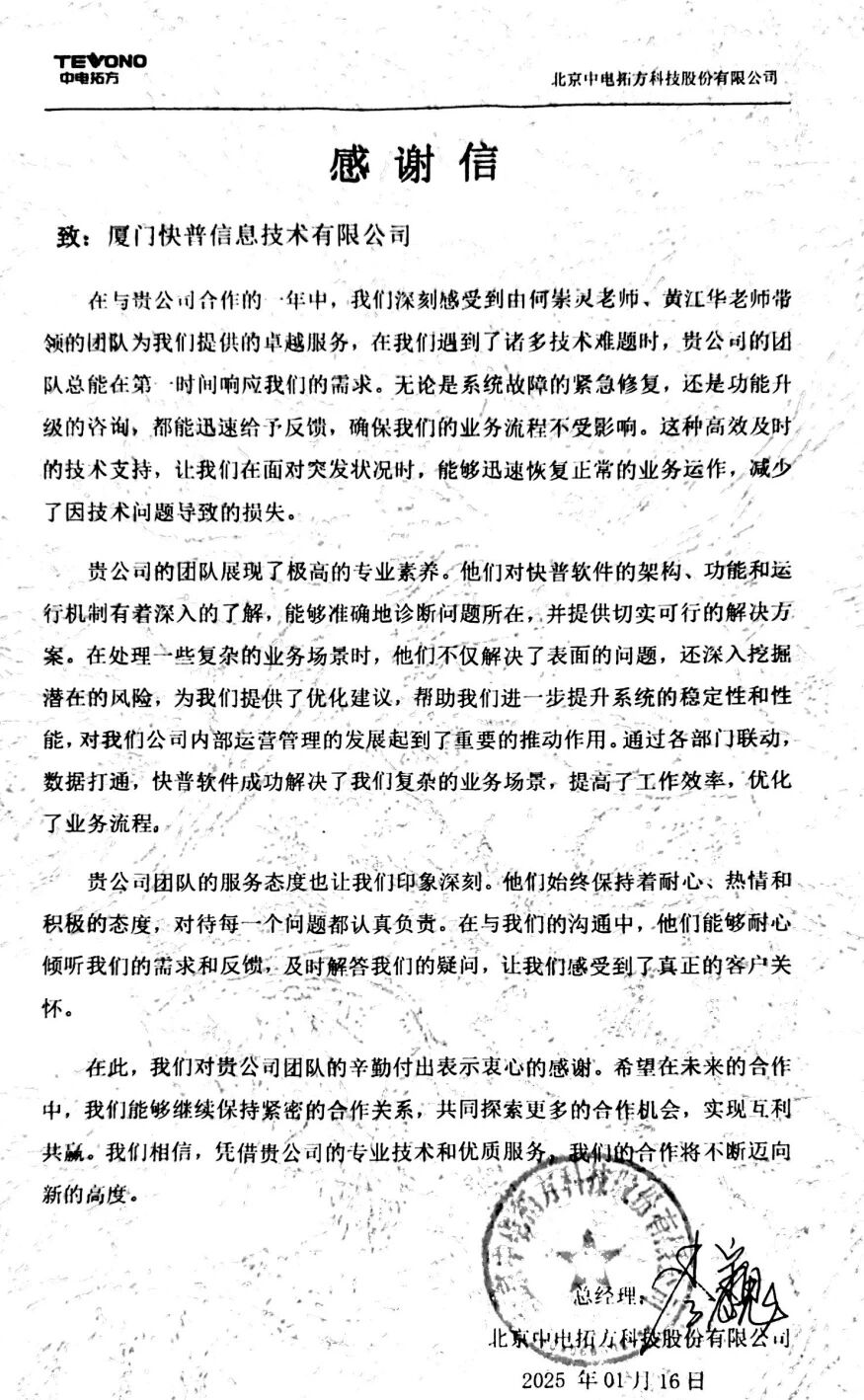 【快普簡(jiǎn)訊】 北京中電拓方科技股份有限公司向我司發(fā)來(lái)感謝信,對(duì)何崇靈老師、黃江華老師帶領(lǐng)的實(shí)施小組在過(guò)去一年中提供的優(yōu)質(zhì)服務(wù)表示高度認(rèn)可和衷心感謝。來(lái)信不僅是對(duì)快普實(shí)施團(tuán)隊(duì)專(zhuān)業(yè)能力的肯定,更是對(duì)快普“客戶(hù)至上”服務(wù)理念的詮釋。